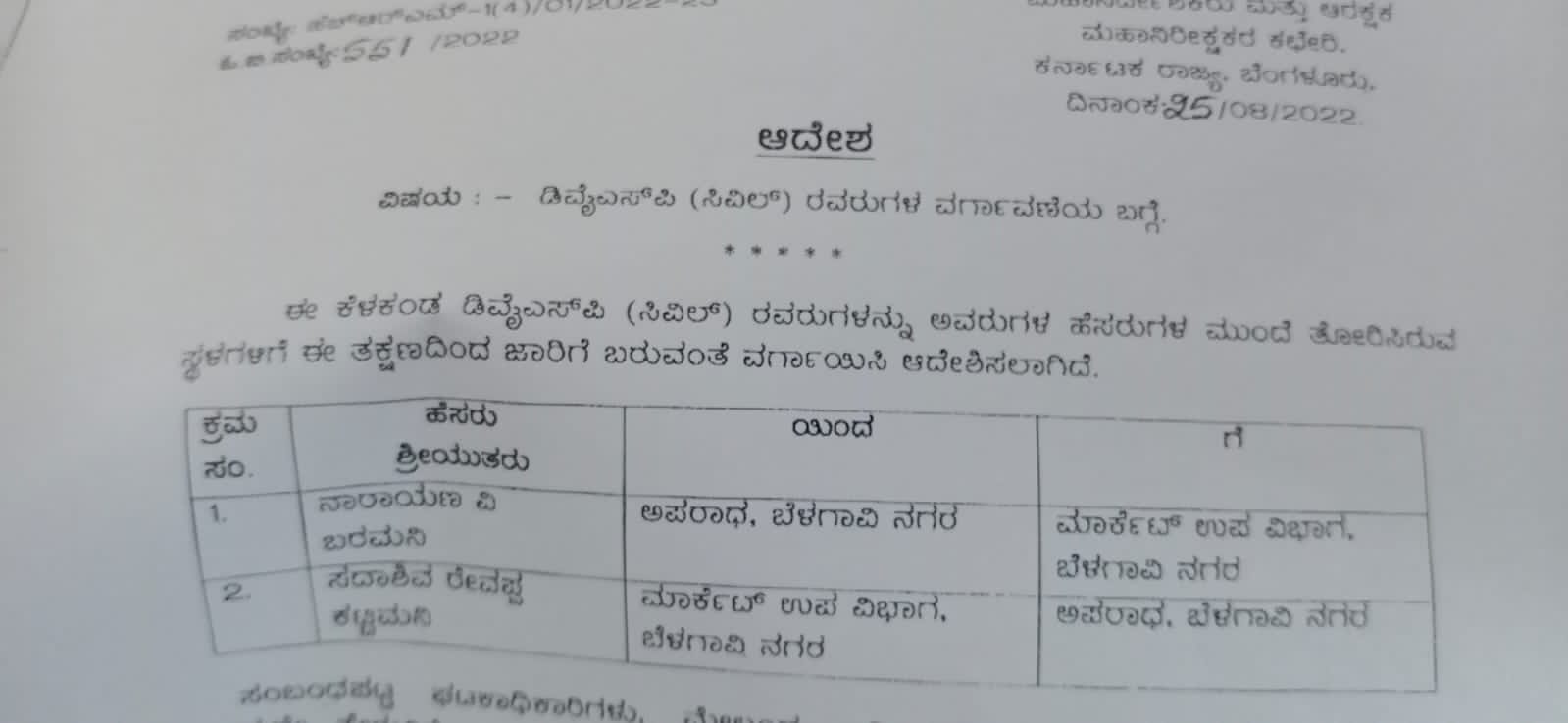 ಬೆಳಗಾವಿ ನಗರದ ಮಾರ್ಕೆಟ್ ವಿಭಾಗದ ಎಸಿಪಿ ಆಗಿದ್ದ ಕಟ್ಡಿಮನಿ ಅವರನ್ನು ಬೆಳಗಾವಿ ನಗರ ಅಪರಾಧ ವಿಭಾಗದ ಎಸಿಪಿಯನ್ನಾಗಿ ವರ್ಗಾಯಿಸಿದೆ. ಭರಮಣಿ ಅವರ ಜಾಗಕ್ಕೆ ಕಟ್ಟಿಮನಿ,ಕಟ್ಟಿಮನಿ ಅವರ ಜಾಗಕ್ಕೆ ಈಗ ನಾರಾಯಣ ಭರಮಣಿ ಅವರು ಬಂದಿದ್ದಾರೆ.