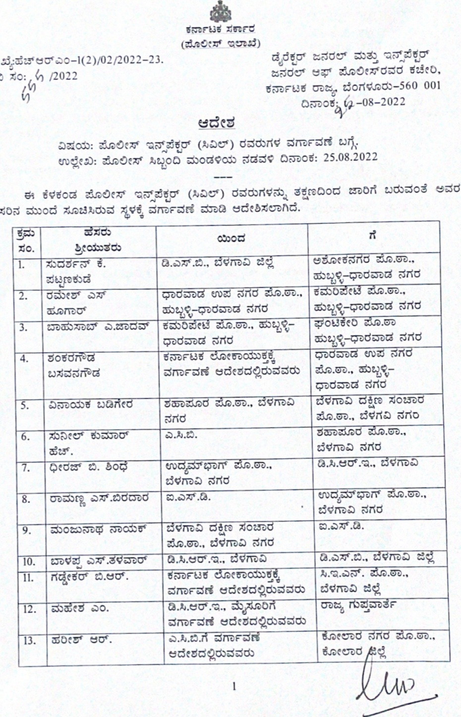 ಗಣೇಶ ಹಬ್ಬದ ಸಂಧರ್ಬದಲ್ಲಿ ಬೆಳಗಾವಿ ಮಹಾನಗರದಲ್ಲಿ ಕಾನೂನು ಸುವ್ಯವಸ್ಥೆ ಕಾಪಾಡುವ ನಿಟ್ಟಿನಲ್ಲಿ ಸರ್ಕಾರ ಮಹತ್ವದ ಬದಲಾವಣೆ ಮಾಡಿದ್ದು ಬೆಳಗಾವಿ ಮಹಾನಗರದ ಹಲವು ಠಾಣೆಗಳ ಪಿಐ ಗಳ ವರ್ಗಾವಣೆ ಆಗಿದೆ.