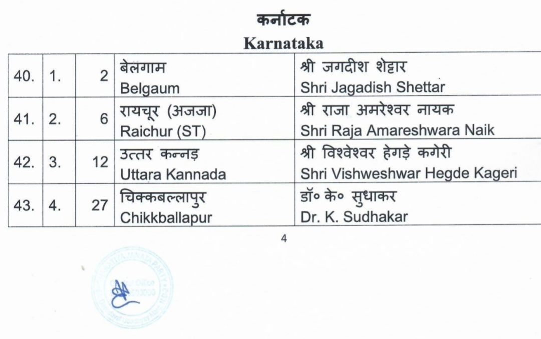ಬೆಳಗಾವಿ – ಕೊನೆಗೂ ಬಿಜೆಪಿ ಪಟ್ಟಿ ಬಿಡುಗಡೆಯಾಗಿದೆ.ಬೆಳಗಾವಿಯಿಂದ ಜಗದೀಶ್ ಶೆಟ್ಟರ್ ಹಾಗೂ ಉತ್ತರ ಕನ್ನಡದಿಂದ ವಿಶ್ವೇಶರ್ ಹೆಗಡೆ ಕಾಗೇರಿ ಅವರು ಫೈನಲ್ ಆಗಿದ್ದಾರೆ.