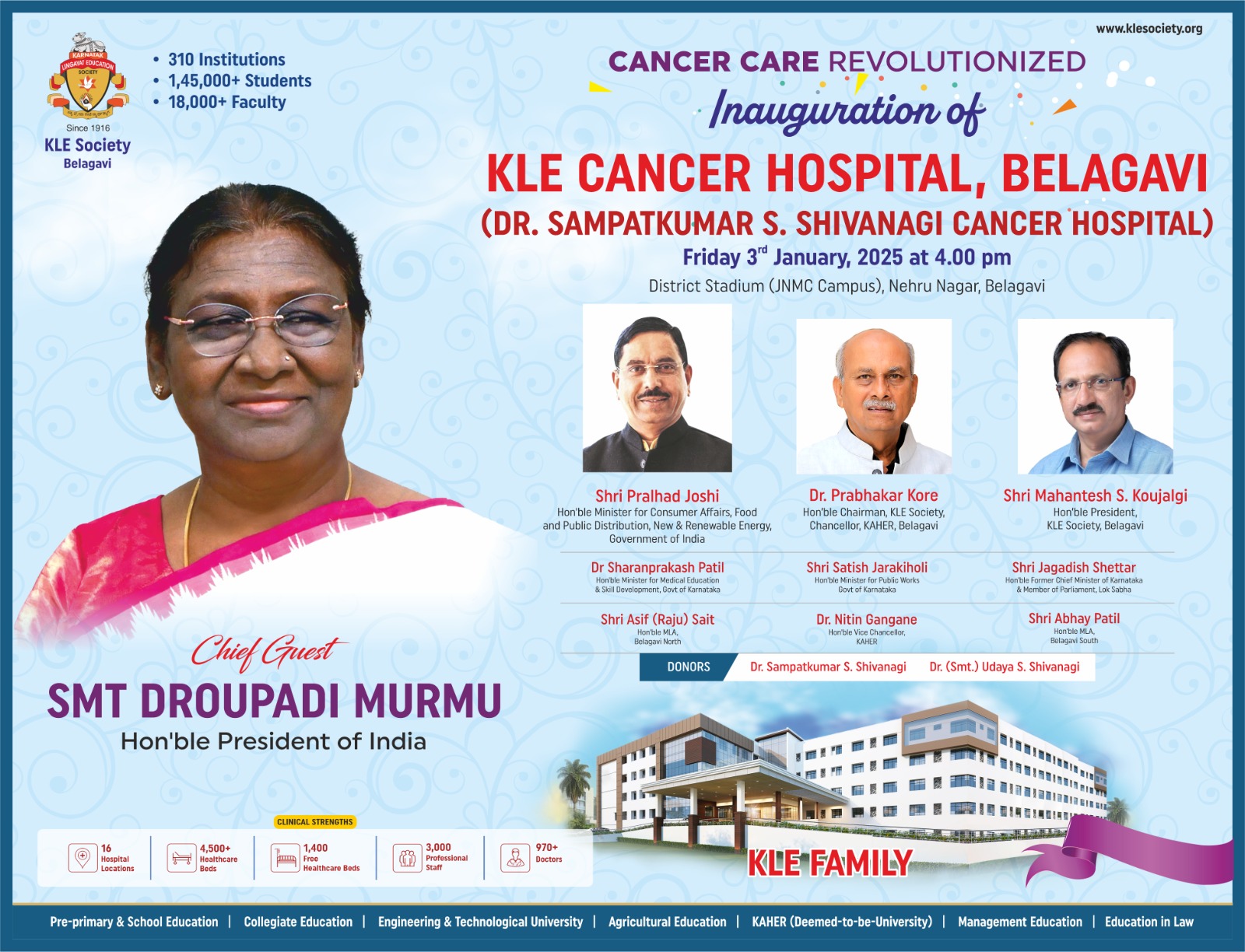 ಕೆಎಲ್ಇ ಸಂಸ್ಥೆ ಬೆಳಗಾವಿಯಲ್ಲಿ ಹೈಟೆಕ್ ಕ್ಯಾನ್ಸರ್ ಆಸ್ಪತ್ರೆಯನ್ನು ನಿರ್ಮಿಸಿದ್ದು ಈ ಆಸ್ಪತ್ರೆಯನ್ನು ಗೌರವಾನ್ವಿತ ರಾಷ್ಟ್ರಪತಿ ಶ್ರೀಮತಿ ದ್ರೌಪದಿ ಮುರ್ಮು ಅವರು ಇಂದು ಶುಕ್ರವಾರ ಸಂಜೆ 4 ಗಂಟೆಗೆ ಬೆಳಗಾವಿಯ ಜಿಲ್ಲಾ ಕ್ರೀಡಾಂಗಣದಲ್ಲಿ ಲೋಕಾರ್ಪಣೆ ಮಾಡಲಿದ್ದಾರೆ.