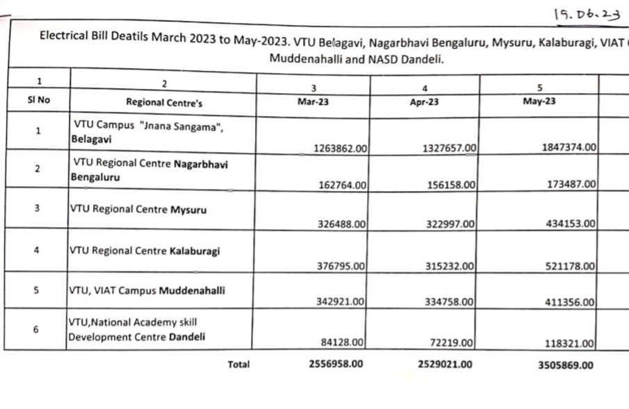 ಮಾರ್ಚ್ ತಿಂಗಳಲ್ಲಿ 25,56,928 ರೂ, ಎಪ್ರಿಲ್ ತಿಂಗಳಲ್ಲಿ 25,29,021 ರೂ, ವಿದ್ಯುತ್ ಬಿಲ್ ಪಾವತಿಸಿದ್ದ ವಿಟಿಯು,