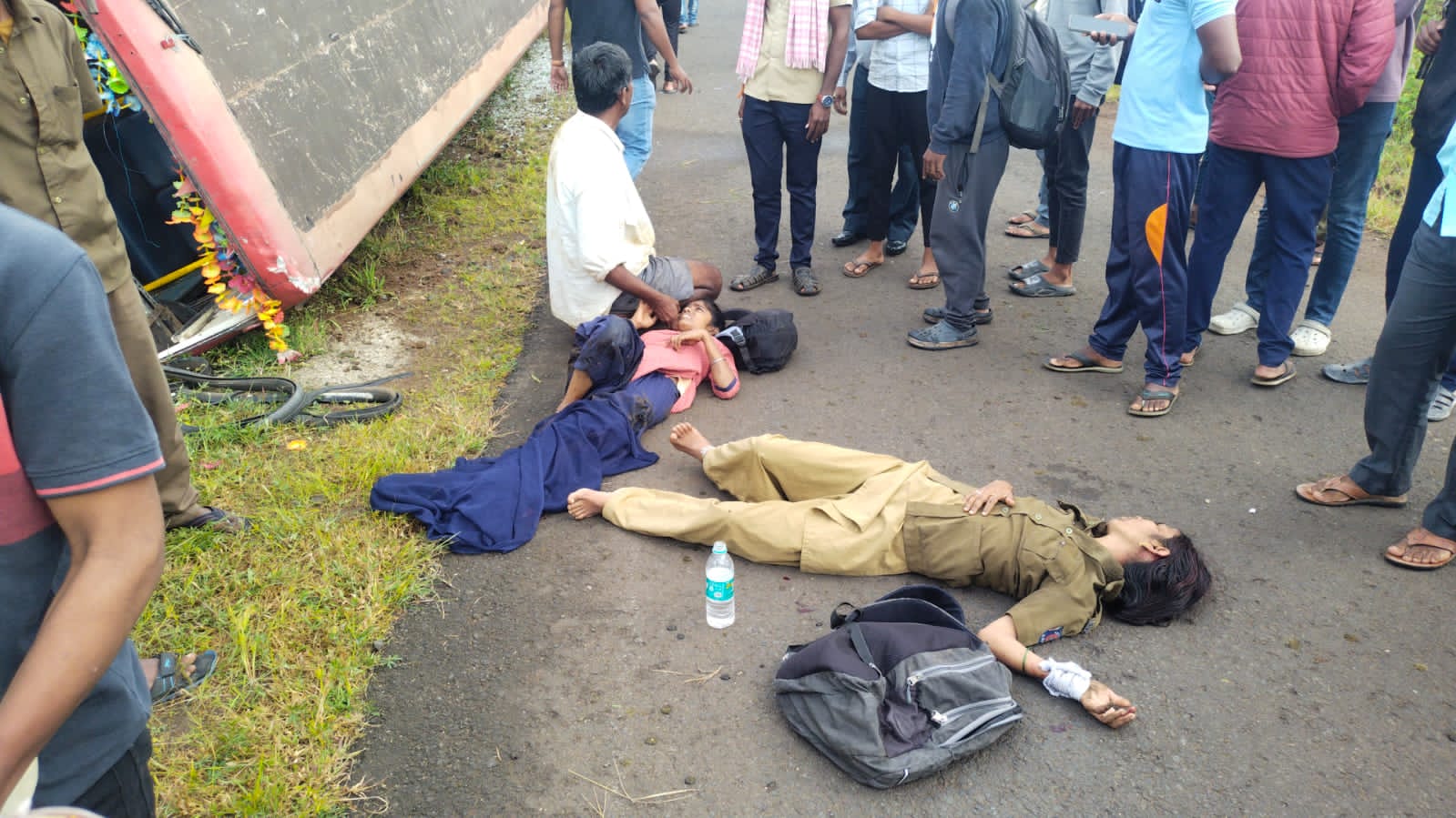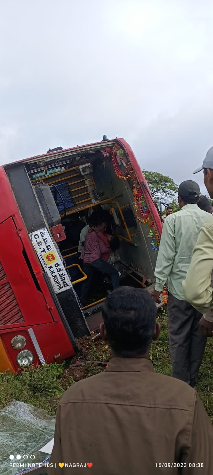 ಬಸ್ ಪಲ್ಟಿಯಾಗಿದ್ದು ಈ ಬಸ್ ನಲ್ಲಿ 40 ಕ್ಕೂ ಹೆಚ್ವು ಜನ ಪ್ರಯಾಣಿಸುತ್ತಿದ್ದರು.ಬಸ್ ನಿರ್ವಾಹಕಿ ಸೇರಿದಂತೆ ಇಬ್ಬರ ಪರಿಸ್ಥಿತಿ ಗಂಭೀರವಾಗಿದೆ.