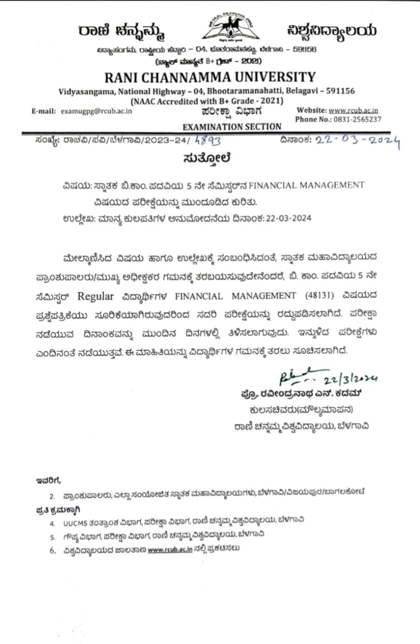 ಬಿಕಾಂ ಪದವಿಯ ಐದನೇಯ ಸೆಮಿಸ್ಟರ್ ಫೈನಾನ್ಸಿಯಲ್ ಮ್ಯಾನೇಜ್ಮೆಂಟ್ ವಿಷಯದ ಪ್ರಶ್ನೆ ಪತ್ರಿಕೆ ಸೋರಿಕೆಯಾಗಿದೆ.ಪರೀಕ್ಷೆಯನ್ನು ರದ್ದು ಪಡಿಸಿ,ವಿಶ್ವವಿದ್ಯಾಲಯದ ಕುಲಸಚಿವರು ಸುತ್ತೋಲೆ ಹೊರಡಿಸಿದ್ದಾರೆ.