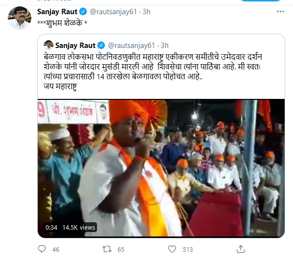 ಬೆಳಗಾವಿ ಲೋಕಸಭಾ ಉಪ ಚುನಾವಣೆಯಲ್ಲಿ ಎಂಈಎಸ್ ಮತ್ತು ಶಿವಸೇನೆಯ ಮೈತ್ರಿ ಅಭ್ಯರ್ಥಿ ಶುಭಂ ಶಿಳಕೆ ಭರ್ಜರಿ ಪ್ರಚಾರ ಮಾಡುತ್ತಿದ್ದಾರೆ,ಅವರ ಪರ ಪ್ರಚಾರ ಮಾಡಲು ಸ್ವತಹ ನಾನು 14 ರಂದು ಬೆಳಗಾವಿಗೆ ಹೋಗುತ್ತಿದ್ದೇನೆ ಎಂದು ಸಂಜಯ ರಾವತ ಟ್ವೀಟ್ ಮಾಡಿದ್ದಾರೆ.