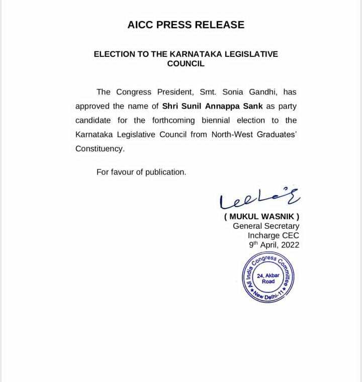 ಬೆಳಗಾವಿ, ಬಾಗಲಕೋಟೆ ಮತ್ತು ವಿಜಯಪುರ ಜಿಲ್ಲೆಗಳನ್ನು ಒಳಗೊಂಡ ವಾಯವ್ಯ ಪದವೀಧರರ ಕ್ಷೇತ್ರದಿಂದ ವಿಧಾನಪರಿಷತ್ಗೆ ನಡೆಯಲಿರುವ ಚುನಾವಣೆಗೆ ಕಾಂಗ್ರೆಸ್ ಅಭ್ಯರ್ಥಿಯಾಗಿ ಜಿಲ್ಲೆಯ ಅಥಣಿಯ ಸುನೀಲ ಸಂಕ ಅವರಿಗೆ ಟಿಕೆಟ್ ನೀಡಲಾಗಿದೆ.