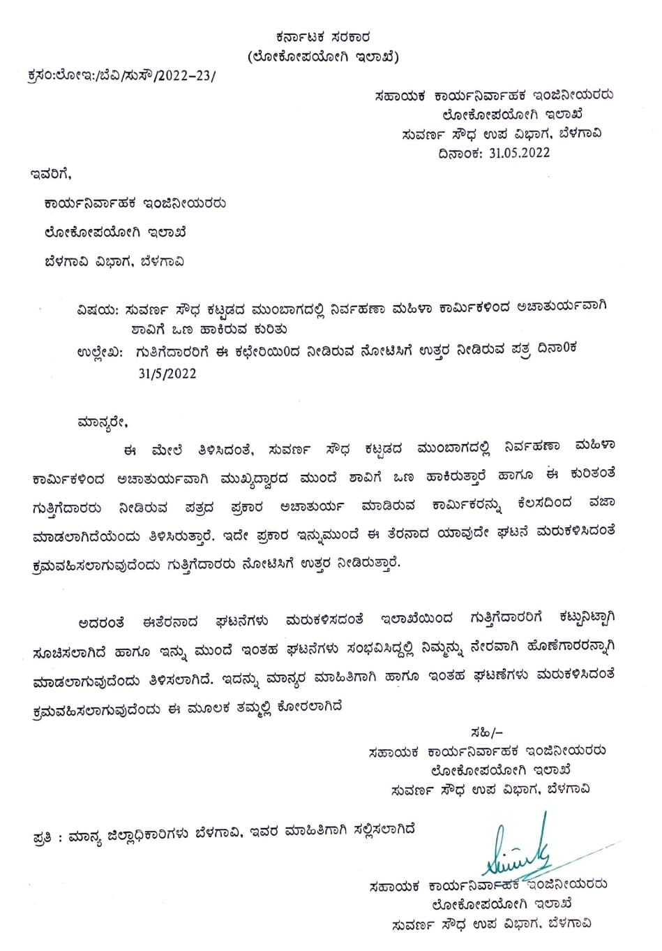 ಗುತ್ತಿಗೆದಾರನಿಗೆ ಕೇವಲ ನೋಟೀಸ್ ಕೊಟ್ಟು ಲೋಕೋಪಯೋಗಿ ಇಲಾಖೆ ಗುತ್ತಿಗೆದಾರನ ವಿರುದ್ಧ ಯಾವುದೇ ಕ್ರಮ ಕೈಗೊಳ್ಳದೇ ಬಡಪಾಯಿ ದಿನಗೂಲಿ ಕಾರ್ಮಿಕ ಮಹಿಳೆಯನ್ನು ಕೆಲಸದಿಂದ ವಜಾ ಮಾಡಿದೆ.