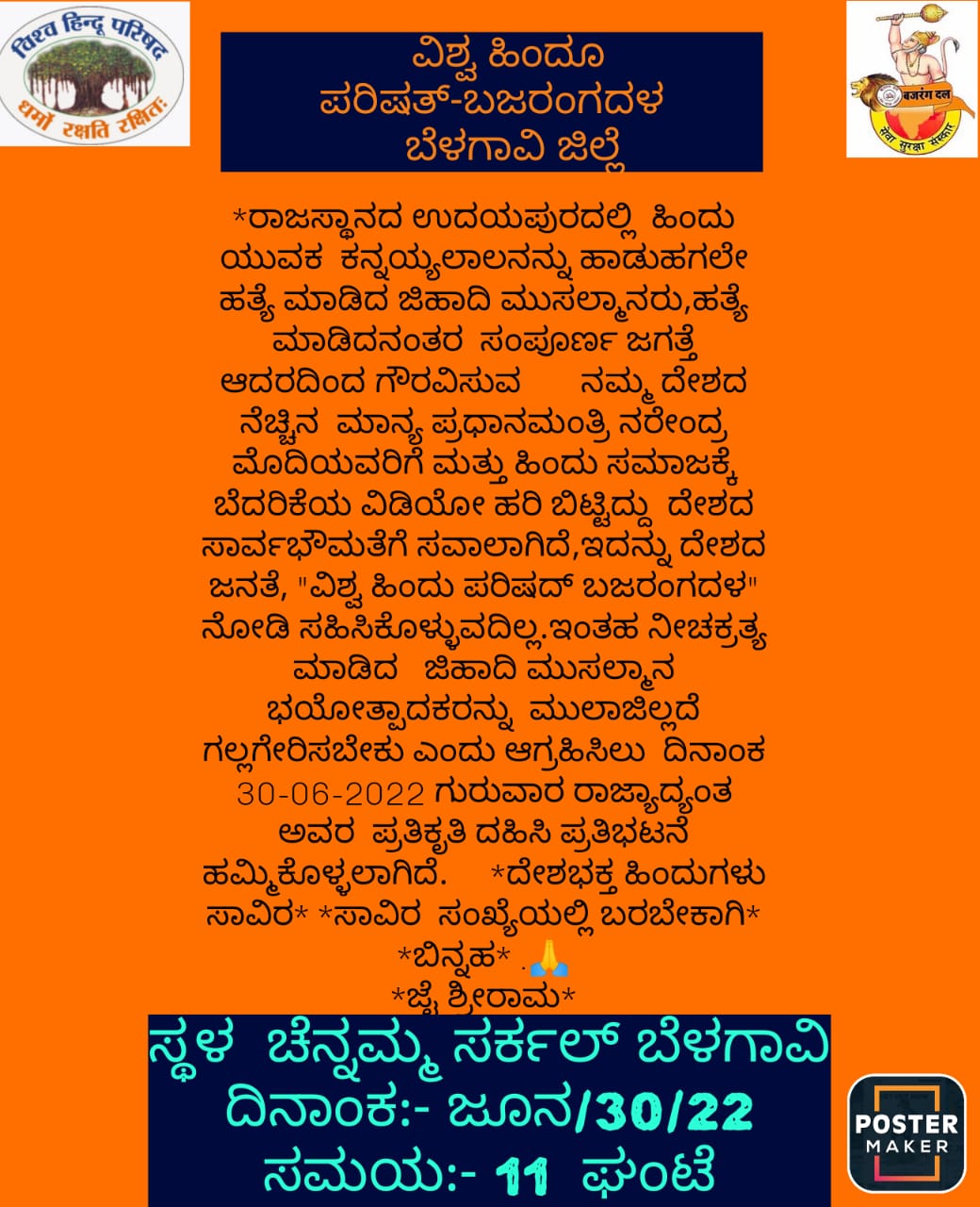 ರಾಜಸ್ಥಾನದಲ್ಲಿ ಗ್ರಾಹಕರ ಸೋಗಿನಲ್ಲಿ ಬಂದು ಟೈಲರ್ ಕನ್ನಯ ಲಾಲ್ ಎಂಬವರನ್ನು ಐಸಿಸ್ ರೀತಿಯಲ್ಲಿ ಕೊಂದು ಶಿರಚ್ಛೇದ ಮಾಡಿ ಸಾಮಾಜಿಕ ಜಾಲತಾಣದಲ್ಲಿ ವೀಡಿಯೋ ವೈರಲ್ ಮಾಡಿದ ಮತಾಂಧ ಕಿರಾತಕರು. ಈ ಘೋರ ಹತ್ಯೆಯನ್ನು ಖಂಡಿಸಿ, *ಸಂಪೂರ್ಣ ಜಗತ್ತೇ ಆದರದಿಂದ ಗೌರವಿಸುವ* *ನಮ್ಮ ದೇಶದ ನೆಚ್ಚಿನ ಮಾನ್ಯ ಪ್ರಧಾನಮಂತ್ರಿ ನರೇಂದ್ರ ಮೋದಿಯವರಿಗೆ ಮತ್ತು ಹಿಂದೂ ಸಮಾಜಕ್ಕೆ ಬೇದರಿಯ ವಿಡಿಯೋ ಹರಿ ಬಿಟ್ಟಿದ್ದು* ದೇಶದ ಸಾರ್ವಭೌಮತೆಗೆ ಸವಾಲಾಗಿದೆ,