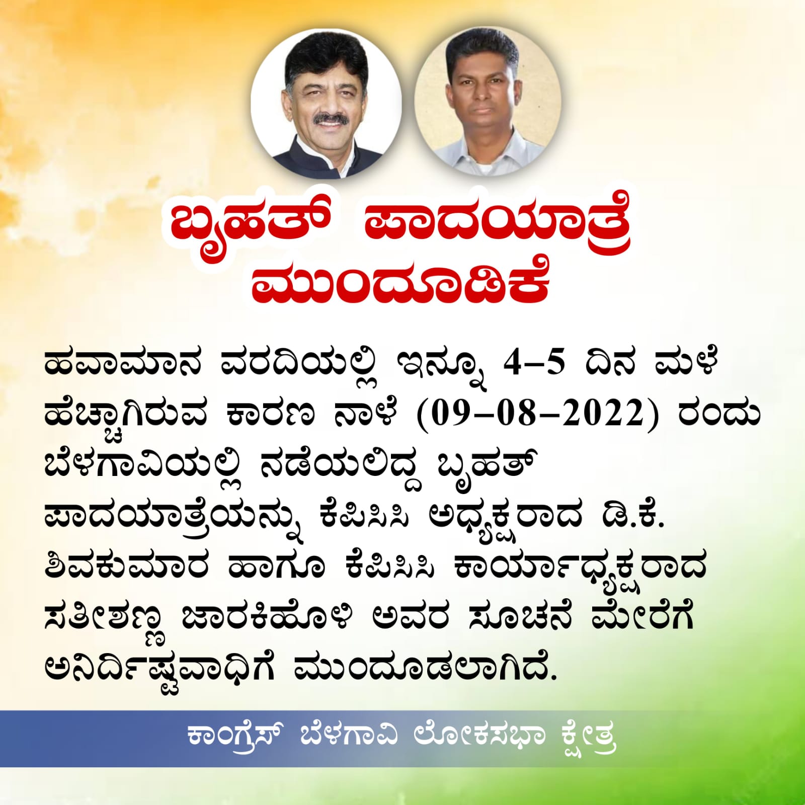 ನಾಳೆ ಮಂಗಳವಾರ ಕೆಪಿಸಿಸಿ ಅಧ್ಯಕ್ಷ ಡಿಕೆ ಶಿವಕುಮಾರ್ ಕೆಪಿಸಿಸಿ ಕಾರ್ಯಾಧ್ಯಕ್ಷ ಸತೀಶ್ ಜಾರಕಿಹೊಳಿ ಅವರ ನೇತ್ರತ್ವದಲ್ಲಿ ಬೆಳಗಾವಿಯಲ್ಲಿ ಬೃಹತ್ತ್ ತಿರಂಗಾ ಯಾತ್ರೆಯನ್ನು ಆತೋಜಿಸಲಾಗಿತ್ತು,ಬೆಳಗಾವಿಯಲ್ಲಿ ನಿರಂತರವಾಗಿ ಮಳೆ ಸುರಿಯುತ್ತಿರುವ ಕಾರಣ ಈ ಪಾದಯತ್ರೆಯನ್ನು ಮುಂದೂಡಲಾಗಿದೆ.