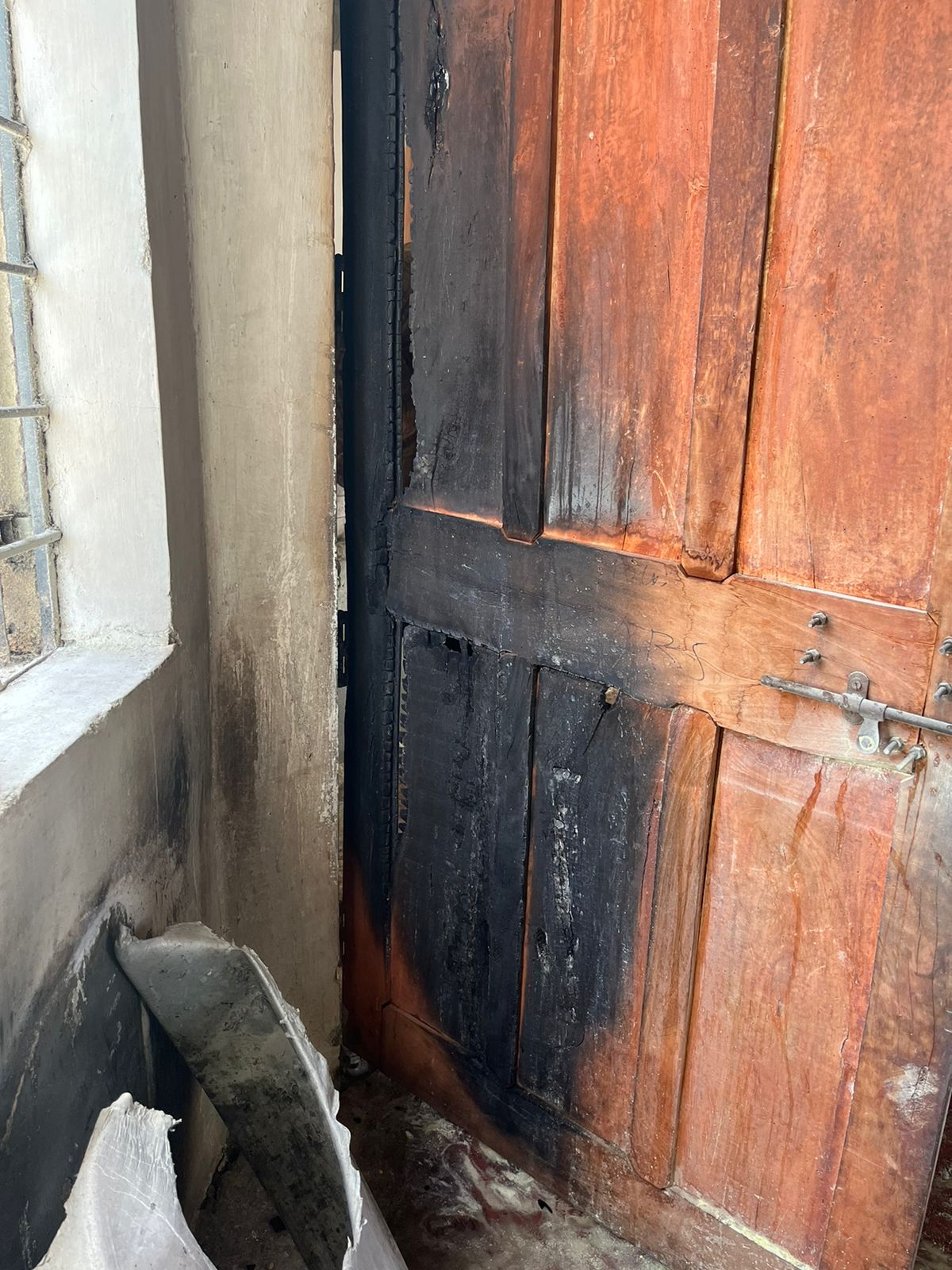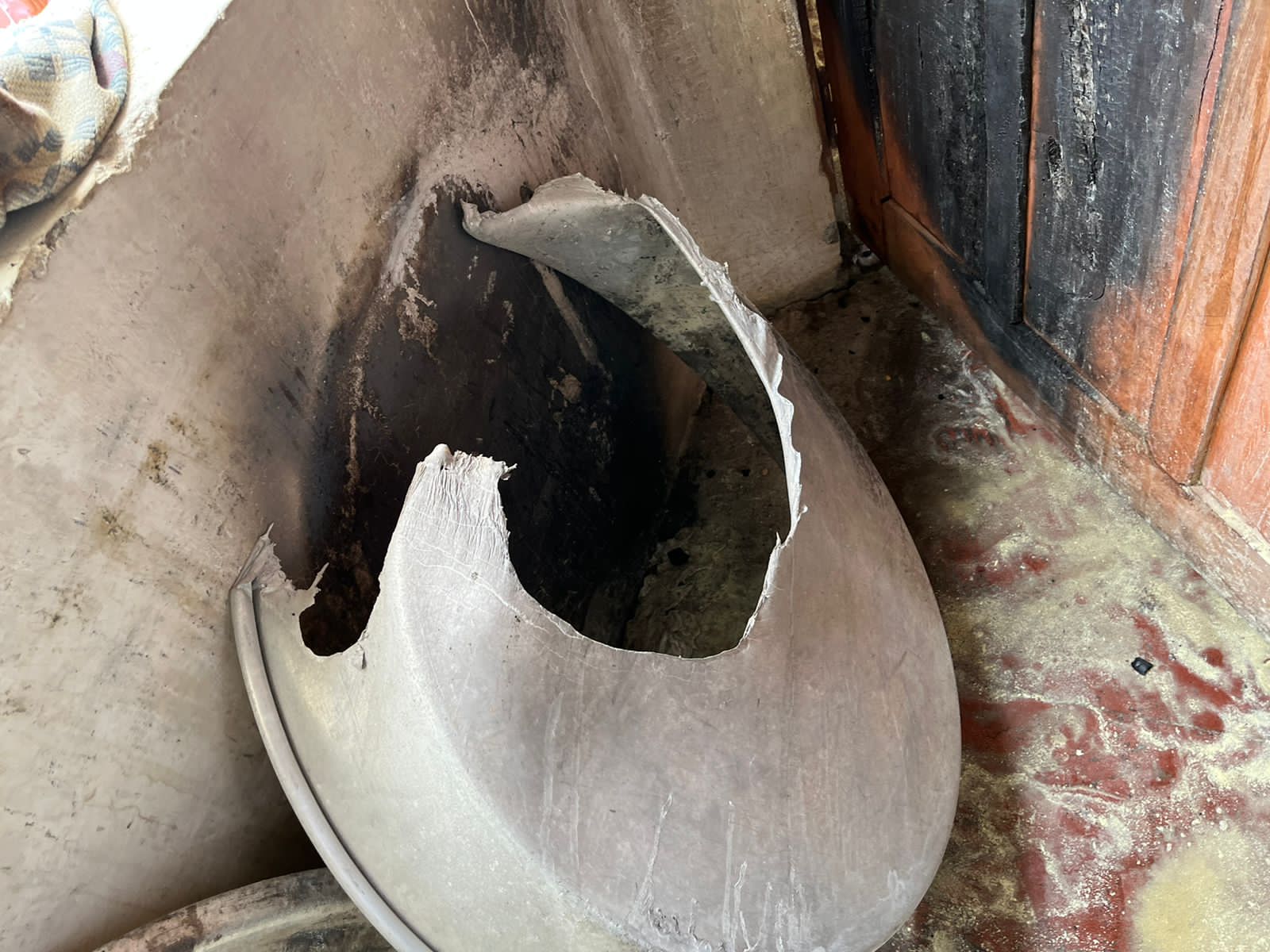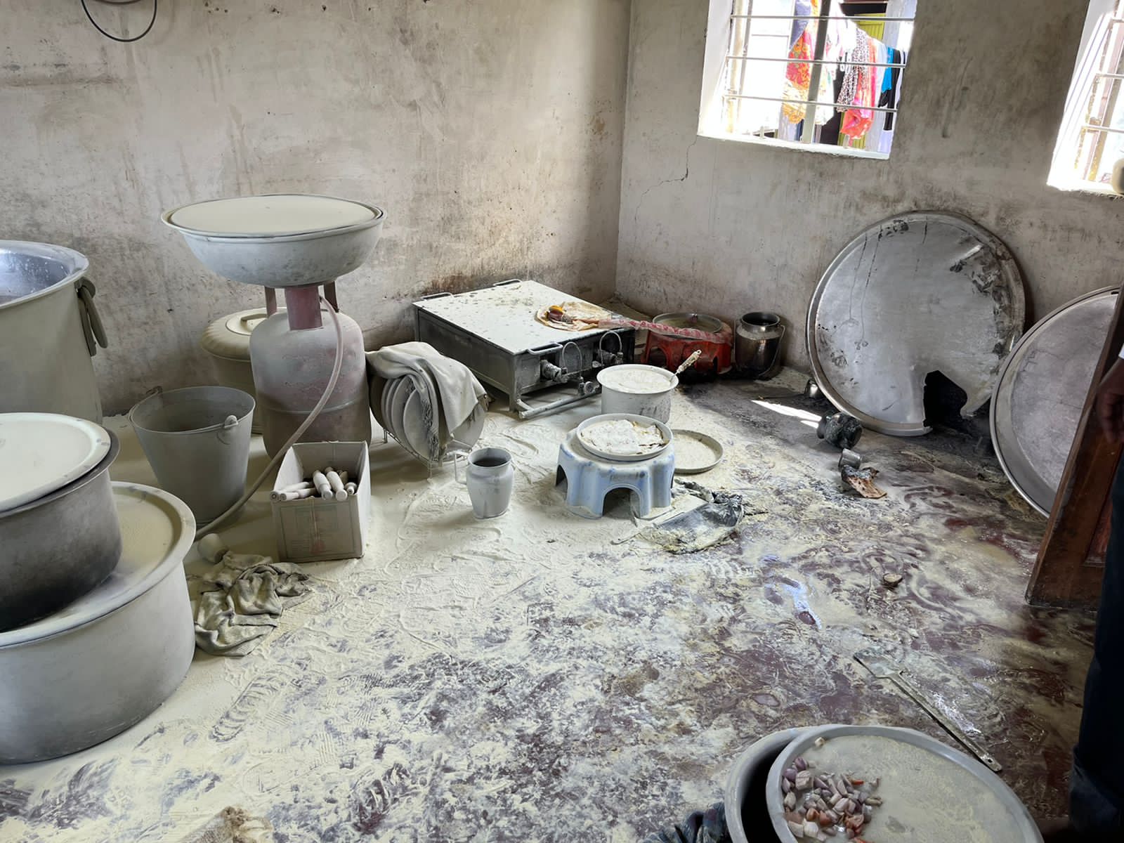 ಕೋಣೆಯಲ್ಲಿರುವ ಅಕ್ಕಿ,ಬೇಳೆ, ಹಾಲಿನ ಪೌಡರ್, ಮಕ್ಕಳಿಗೆ ನೀಡಲು ಮಾಡಲಾದ ದೋಸೆ ಸೇರಿದಂತೆ ಪಾತ್ರೆಗಳು ಒಡೆದು ಹೋಗಿವೆ.