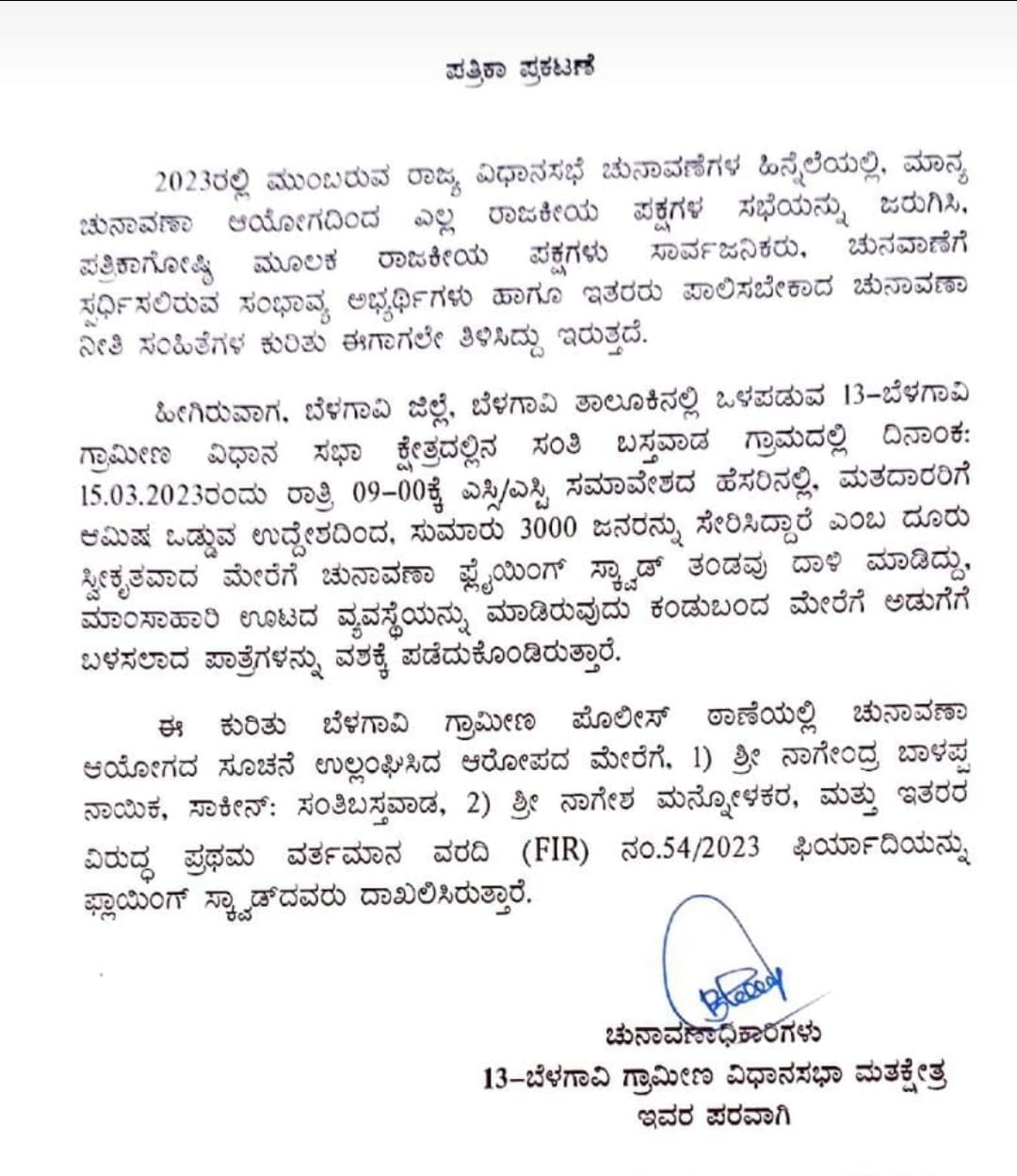 ಬೆಳಗಾವಿ ಗ್ರಾಮೀಣ ಕ್ಷೇತ್ರದ ಸಂತಿ ಬಸ್ತವಾಡದಲ್ಲಿ ನಡೆದ ರಾಜಕೀಯ ಕಾರ್ಯಕ್ರಮದಲ್ಲಿ ಮೂರು ಸಾವಿರ ಜನರಿಗೆ ಬಾಡೂಟ ಮಾಡಿಸಿದ ದೂರು ಬಂದ ಹಿನ್ನಲೆಯಲ್ಲಿ ಬೆಳಗಾವಿ ಗ್ರಾಮೀಣ ಕ್ಷೇತ್ರದ ಬಿಜೆಪಿ ಟಿಕೆಟ್ ಆಕಾಂಕ್ಷಿ ನಾಗೇಶ್ ಮನ್ನೋಳಕರ,ಹಾಗು ರಮೇಶ್ ಜಾರಕಿಹೊಳಿ ಅವರ ಆಪ್ತ ನಾಗೇಂದ್ರ ಬಾಳಪ್ಪ ನಾಯಕ ಇಬ್ಬರ ವಿರುದ್ಧ ಬೆಳಗಾವಿ ಗ್ರಾಮೀಣ ಪೋಲೀಸ್ ಠಾಣೆಯಲ್ಲಿ FIR ದಾಖಲಾಗಿದೆ.
