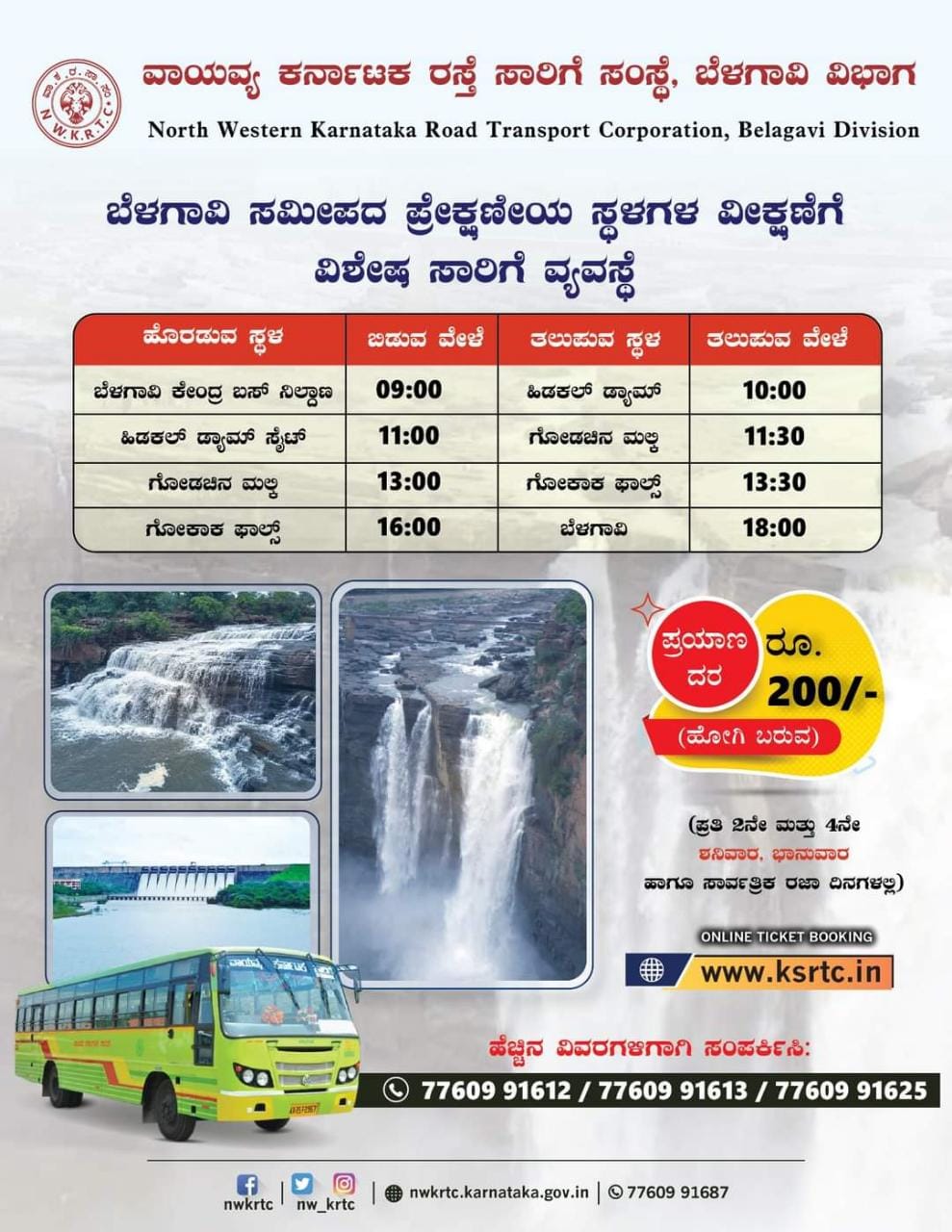 ಕೇವಲ 200 ₹ ದರದಲ್ಲಿ ಹಿಡಕಲ್ ಡ್ಯಾಂ, ಗೋಕಾಕ್ ಫಾಲ್ಸ್ ದರ್ಶನ ಮಾಡಿಸಲು,ಬೆಳಗಾವಿ ಬಸ್ ನಿಲ್ಧಾಣದಿಂದ ಬೆಳಗ್ಗೆ 9-00 ಗಂಟೆಗೆ ಬಸ್ ಬಿಡಲಿದೆ.ಈ ಬಸ್ ಜಿಲ್ಲೆಯ ಮೂರು ಪ್ರವಾಸಿ ತಾಣಗಳ ದರ್ಶನ ಮಾಡಿಸಿ ಈ ವಿಶೇಷ ಬಸ್ ಸಂಜೆ ಆರು ಘಂಟೆಗೆ ಮತ್ತೆ ಬೆಳಗಾವಿ ನಗರಕ್ಕೆ ತಲುಪಲಿದೆ.