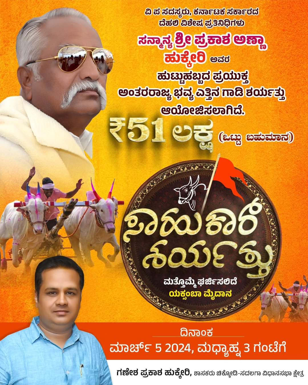 ಅಂತರರಾಜ್ಯ ಭವ್ಯ ಎತ್ತಿನಗಾಡಿ ಓಡಿಸುವ ಈ ಸ್ಪರ್ದೆ ಮಾರ್ಚ್ 5 ರಂದು ಮಧ್ಯಾಹ್ನ 3 ಗಂಟೆಗೆ ಚಿಕ್ಕೋಡಿಯ ಎಕ್ಸಂಬಾ ಪಟ್ಟಣದ ಮೈದಾನದಲ್ಲಿ ನಡೆಯಲಿದೆ. ಈ ಸ್ಪರ್ದೆಯ ಟೈಟಲ್ ಸಾಹುಕಾರ್ ಶರ್ಯತ್ತು. ಈ ಸ್ಪರ್ದೆಯಲ್ಲಿ ವಿಜೇತರಾದವರಿಗೆ ಒಟ್ಟು 51 ಲಕ್ಷ ರೂ ಬಹುಮಾನ ನೀಡುವ ಮೂಲಕ ಪ್ರಕಾಶ್ ಹುಕ್ಕೇರಿ,ಮತ್ತು ಗಣೇಶ್ ಹುಕ್ಕೇರಿ ಅವರು ರಿಕಾರ್ಡ್ ಬ್ರೇಕ್ ಮಾಡಿದ್ದಾರೆ.