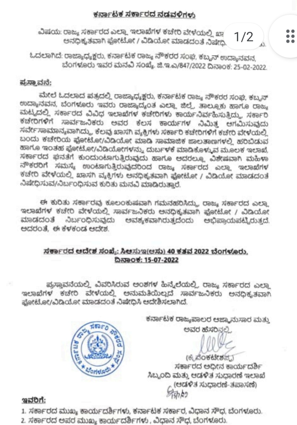ರಾಜ್ಯ ಸರ್ಕಾರಿ ನೌಕರರ ಸಂಘ,ರಾಜ್ಯ ಸರ್ಕಾರಕ್ಕೆ ಮಾಡಿಕೊಂಡ ಮನವಿಗೆ ಸ್ಪಂದಿಸಿರುವ ಸರ್ಕಾರ,ಸರ್ಕಾರಿ ಕಚೇರಿಗಳಲ್ಲಿ ,ಪೋಟೋ ವಿಡಿಯೋ ತೆಗೆಯುವದನ್ನು ನಿಷೇಧಿಸಿ ಆದೇಶ ಹೊರಡಿಸಿದೆ.