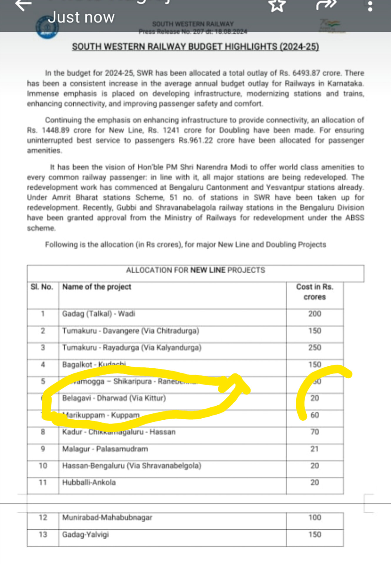 ರಾಜ್ಯ ಸರ್ಕಾರ ಇನ್ನುವರೆಗೆ ಧಾರವಾಡ- ಕಿತ್ತೂರು- ಬೆಳಗಾವಿ ಹೊಸ ರೈಲು ಮಾರ್ಗದ ಯೋಜನೆಗೆ ಇನ್ನುವರೆಗೆ ಭೂಸ್ವಾಧೀನ ಮಾಡಿಲ್ಲ, ವರ್ಕ್ ಶುರು ಆಗಿಲ್ಲ ಅಂತಾ ಈ ಯೋಜನೆಗೆ ನಾಮಕೇ ವಾಸ್ತೆ ಕೇವಲ 20 ಕೋಟಿ ಅನುದಾನ ನೀಡಿದೆ.
