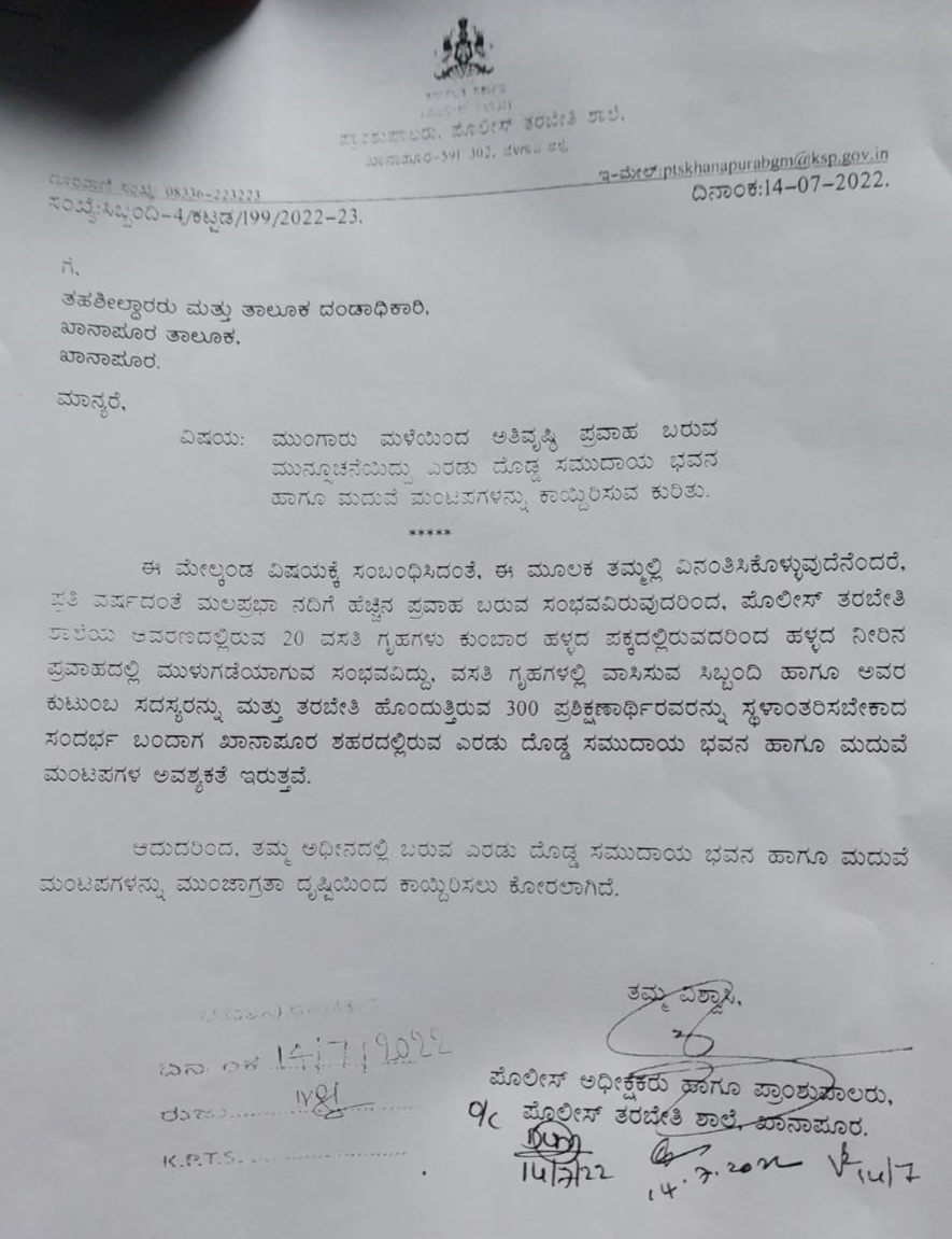 ಖಾನಾಪುರ ತಹಶಿಲ್ದಾರ್, ಪಟ್ಟಣ ಪಂಚಾಯತಿ ಮುಖ್ಯಾಧಿಕಾರಿಗೆ ತರಬೇತಿ ಕೇಂದ್ರದ ಪ್ರಾಂಶುಪಾಲರು ಪತ್ರ ಬರೆದು,ಕೇಂದ್ರ ಜಲಾವೃತವಾಗುವ ಆತಂಕವಿದೆ ಪ್ರವಾಹ ಪರಿಸ್ಥಿತಿ ಎದುರಾದರೆ,ಎರಡು ಸಮುದಾಯ ಭವನಗಳ ವ್ಯವಸ್ಥೆ ಮಾಡಬೇಕು ಎಂದು ಪತ್ರದಲ್ಲಿ ಕೋರಲಾಗಿದೆ.