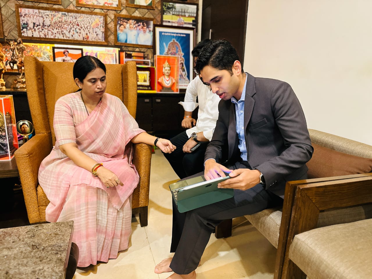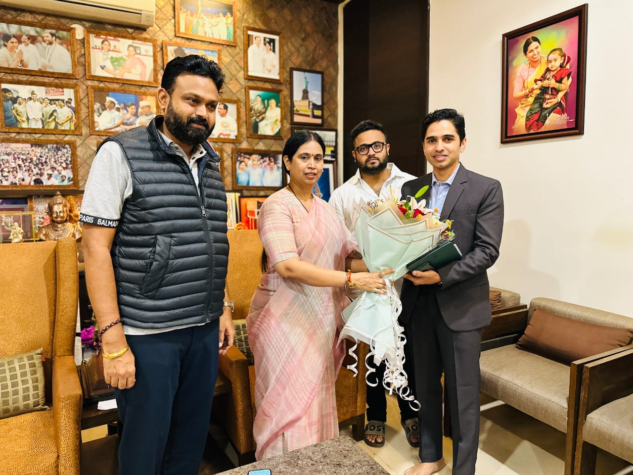 ಸಚಿವೆ ಲಕ್ಷ್ಮೀ ಹೆಬ್ಬಾಳಕರ್ ಅವರ ಕುವೆಂಪು ನಗರದಲ್ಲಿರುವ ಗೃಹ ಕಚೇರಿಯಲ್ಲಿ ಸಚಿವೆ ಲಕ್ಷ್ಮೀ ಹೆಬ್ಬಾಳಕರ್ ಎಂಎಲ್ಸಿ ಚನ್ನರಾಜ್ ಹಟ್ಟಿಹೊಳಿ , ಲಕ್ಷ್ಮೀ ಪುತ್ರ ಮೃನಾಲ ಅವರು ಜಿಲ್ಲಾಧಿಕಾರಿ ಮಹ್ಮದ್ ರೋಷನ್ ಅವರಿಗೆ ಹೂಗುಚ್ಛ ನೀಡಿ ಸ್ವಾಗತಿಸಿದರು.