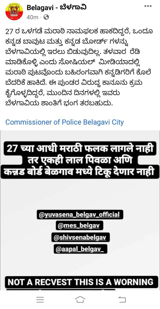 ಈ ಪೋಸ್ಟನಲ್ಲಿ ಕನ್ನಡಿಗರಿಗೆ, ಕರ್ನಾಟಕ ಸರ್ಕಾರ ಕ್ಕೆ ಬೆದರಿಕೆ ಹಾಕಲಾಗಿದೆ.ಜೂನ್ 27 ರ ಒಳಗಾಗಿ ಬೆಳಗಾವಿಯಲ್ಲಿ ಮರಾಠಿ ಬೋರ್ಡ್ ಹಾಕಬೇಕು,ಇಲ್ಲವೇ ಒಂದೇ ಒಂದು ಕನ್ನಡ ಬೋರ್ಡ್ ಇರಲು ಬಿಡಲ್ಲ,ಇದು ಮನವಿ ಅಲ್ಲ ಎಚ್ಚರಿಕೆ ಎಂದು ಪೋಸ್ಟ್ ಮಾಡಲಾಗಿತ್ತು.