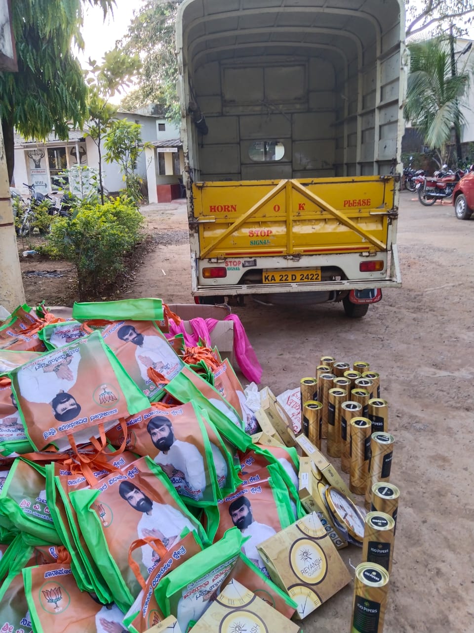 ಶ್ರೀ ಎ .ದಿಲೀಪ್ ಕುಮಾರ್ ಬಿಜೆಪಿ ಮುಖಂಡರು ,ಖಾನಾಪುರ ವಿಧಾನಸಭಾ ಕ್ಷೇತ್ರ. ಇವರ ಹೆಸರಿರುವ ಹಾಗೂ ಇವರ ಫೋಟೋ ಇರುವ, ಬಿಜೆಪಿ ಪಕ್ಷದ ಚಿಹ್ನೆ ಇರುವ ಚೀಲಗಳ ಸಮೇತ,Ka.22 D 2422 tata ace ಮಿನಿ ಗೂಡ್ಸ್ ವಾಹನದಲ್ಲಿ