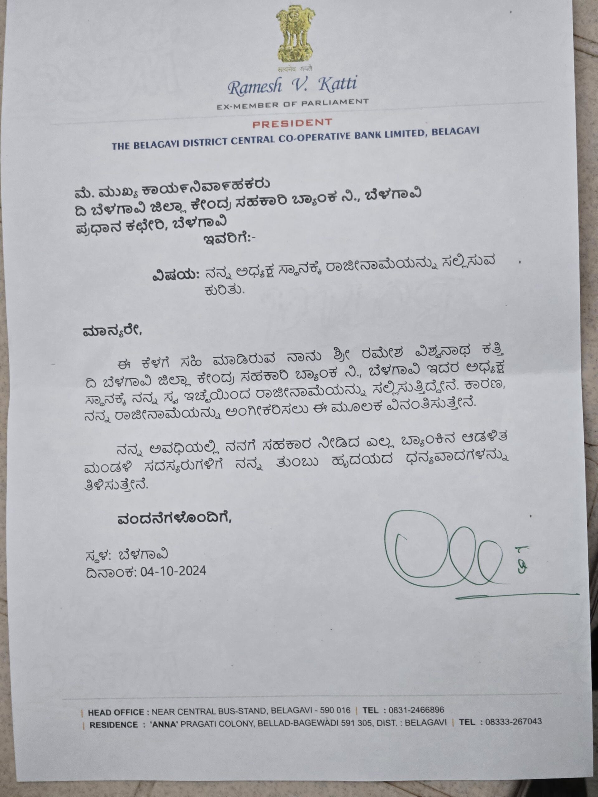 ಈ ಕೆಳಗೆ ಸಹಿ ಮಾಡಿರುವ ನಾನು ಶ್ರೀ ರಮೇಶ್ ವಿಶ್ವನಾಥ ಕತ್ತಿ,ದಿ ಬೆಳಗಾವಿ ಜಿಲ್ಲಾ ಕೇಂದ್ರ ಸಹಕಾರಿ ಬ್ಯಾಂಕ್ ನಿ.ಬೆಳಗಾವಿ, ಇದರ ಅಧ್ಯಕ್ಷ ಸ್ಥಾನಕ್ಕೆ,ಸ್ವ ಇಚ್ಛೆಯಿಂದ ರಾಜೀನಾಮೆ ಸಲ್ಲಿಸುತ್ತಿದ್ದೇನೆ.ಕಾರಣ ನನ್ನ ರಾಜೀನಾಮೆಯನ್ನು ಅಂಗೀಕರಿಸಲು ಈ ಮೂಲಕ ವಿನಂತಿಸಿಕೊಳ್ಳುತ್ತೇನೆ.