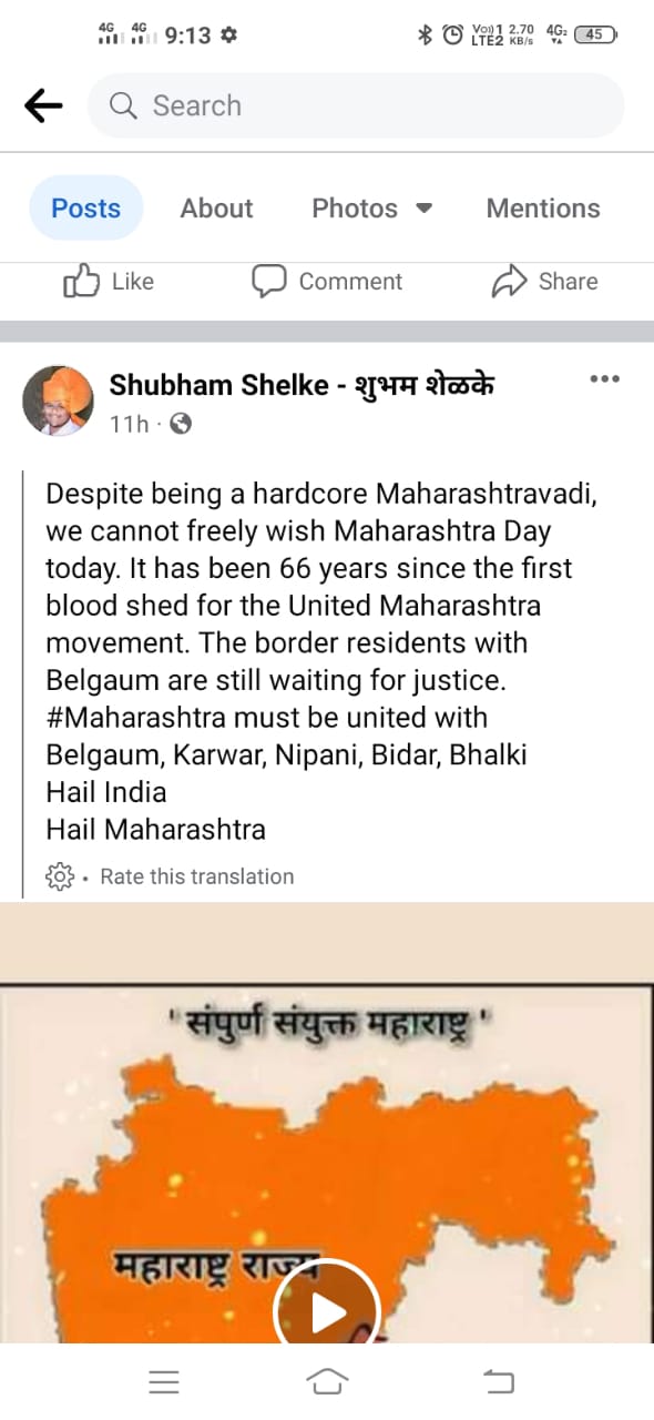 ಎಂಇಎಸ್ ಮುಖಂಡ ಶುಭಂ ಶಳಕೆ ತನ್ನ ಫೇಸ್ ಬುಕ್ ನಲ್ಲಿ ಗಡಿ ವಿವಾದದ ಕುರಿತು ವಿಡಿಯೋ ಪೋಸ್ಟ್ ಮಾಡಿದ್ದಾನೆ.