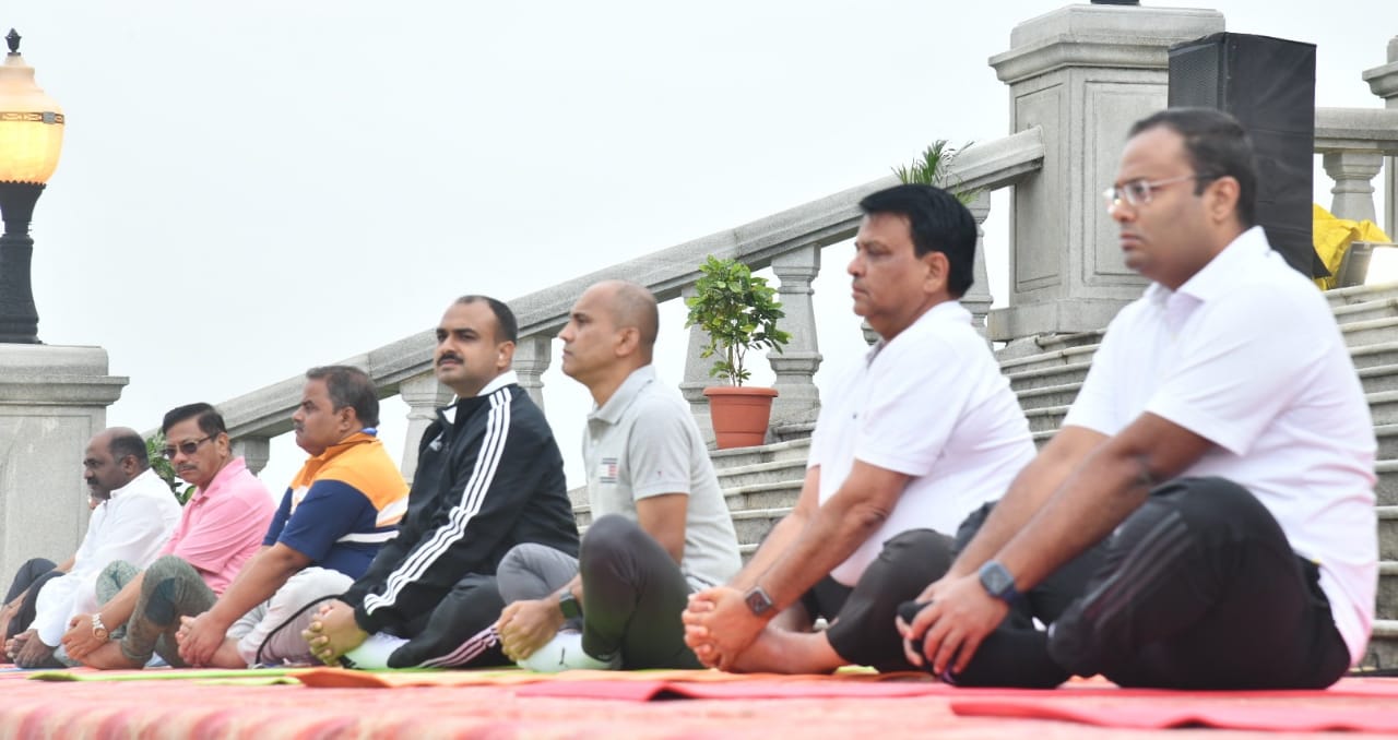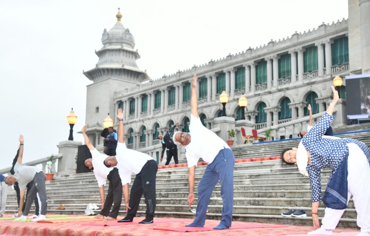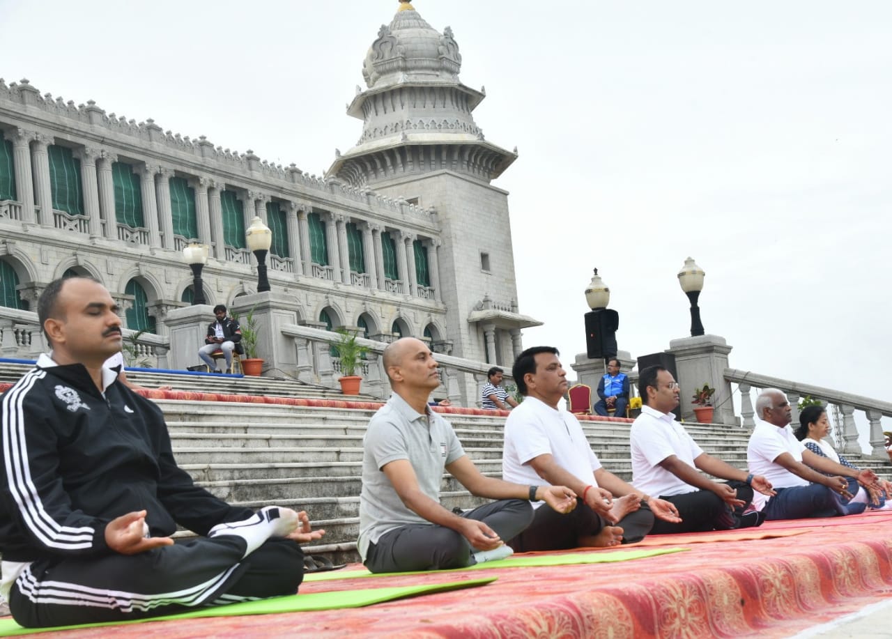 ಬೆಳಗಾವಿ-ಮಾನವೀಯತೆಗಾಗಿ ಯೋಗ” ಎಂಬ ಘೋಷವಾಕ್ಯದೊಂದಿಗೆ ಇಲ್ಲಿನ ಸುವರ್ಣ ವಿಧಾನಸೌಧದ ಮುಂಭಾಗದ ಆವರಣದಲ್ಲಿ ಮಂಗಳವಾರ (ಜೂ.21) 8ನೇ ಅಂತರರಾಷ್ಟ್ರೀಯ ಯೋಗ ದಿನವನ್ನು ಅತ್ಯಂತ ಸಂಭ್ರಮದಿಂದ ಹಾಗೂ ಅರ್ಥಪೂರ್ಣವಾಗಿ ಆಚರಿಸಲಾಯಿತು.